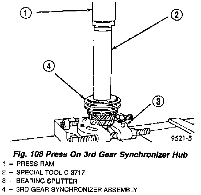 3. Install 3rd gear and 3-4 synchronizer onto input shaft. Install Tool #C-3717 over input shaft and press on synchronizer hub and 3rd gear (Fig. 108). The synchronizer hub has the letter U stamped on the top face of the hub. This designates that the hub must be installed with the U facing upward.