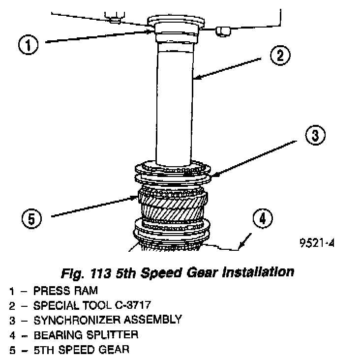 11. Using special tool #C-3717, install 5th speed gear and synchronizer (Fig. 113). The 5th gear synchronizer hub has the letter S stamped on the top face of the hub. This designates that the hub must be installed with the S facing upward.