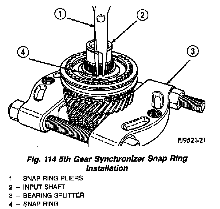 12. Install 5th gear synchronizer snap ring (Fig. 114).