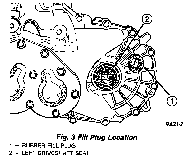 All NV T350 (A-578) transaxles are equipped with a fill plug. The fill plug is located on the left side of the transaxle differential area (Fig. 3). The fluid level should be within 3/16 inch from the bottom of the transaxle fill hole (vehicle must be level when checking).