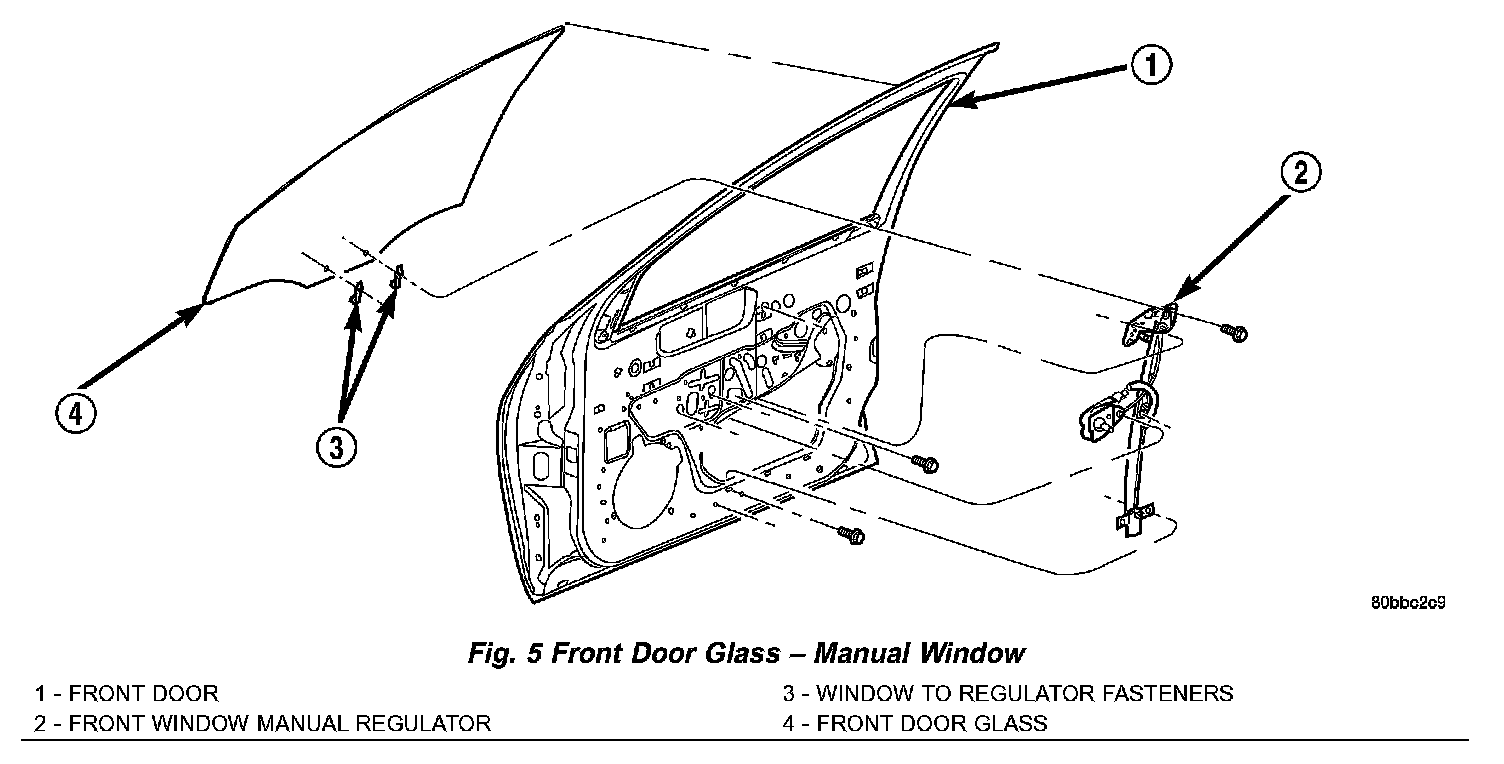 5. Remove bolts attaching door glass to window regulator lift plates (Fig. 4) and (Fig. 5).