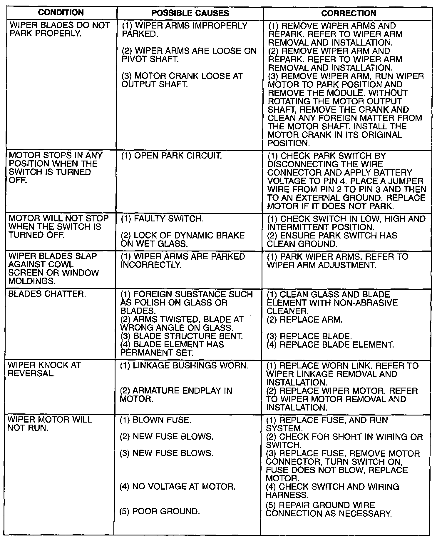 Whenever a wiper motor malfunction occurs, verify that the wire harness is properly connected, then start normal diagnosis and repair procedures. Refer to Wiper Motor Test table.
