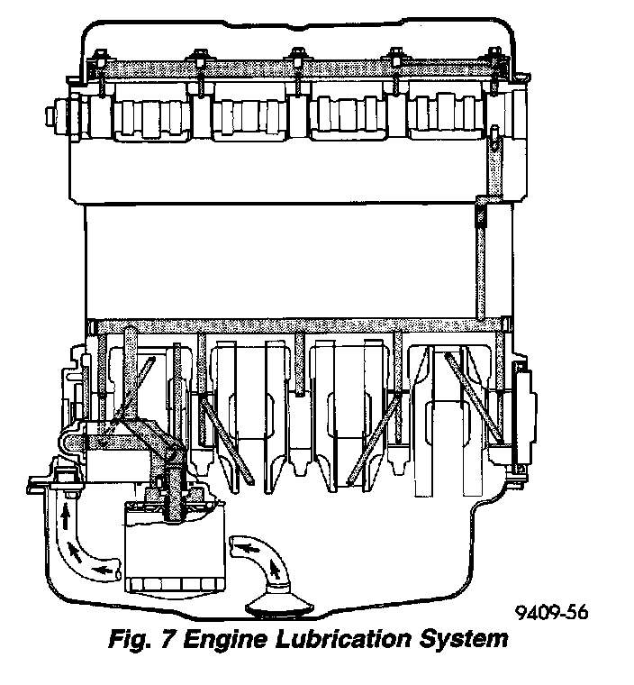 The lubrication system is a full-flow filtration, pressure feed type. The oil pump is mounted in the front engine cover and driven by the crankshaft (Fig. 6).