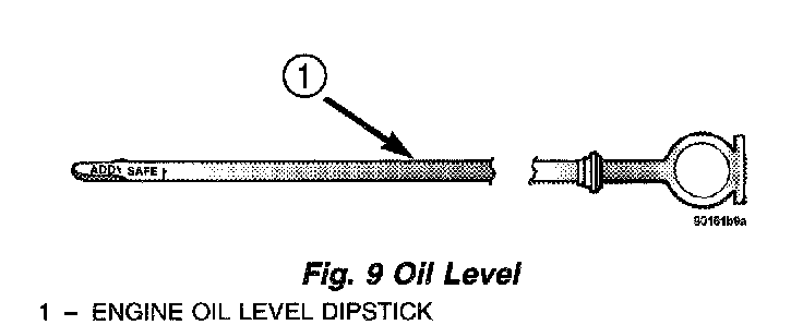 Checking the oil while the vehicle is on level ground will improve the accuracy of the oil level reading. Remove dipstick, (Fig. 8) and observe oil level. Add oil only when the level is at or below the ADD mark (Fig. 9).