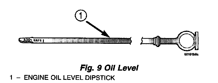 Checking the oil while the vehicle is on level ground will improve the accuracy of the oil level reading. Remove dipstick (Fig. 8), and observe oil level. Add oil only when the level is at or below the ADD mark (Fig. 9).