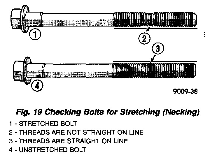 The cylinder head bolts are torqued using the torque yield method, they should be examined BEFORE reuse. If the threads are necked down, the bolts must be replaced. Necking can be checked by holding a scale or straight edge against the threads. If all the threads do not contact the scale the bolt should be replaced.