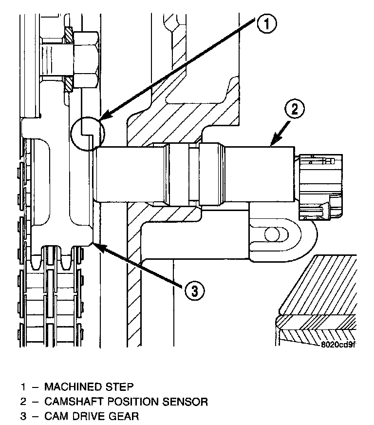 A low and high area are machined into the camshaft drive gear. The sensor is positioned in the timing gear cover so that a small air gap exists between the face of sensor and the high machined area of cam gear.