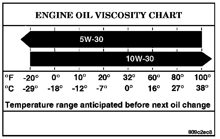 An SAE viscosity grade is used to specify the viscosity of engine oil. Use only engine oils with multiple viscosities such as 5W-30 or 10W-30. These are specified with a dual SAE viscosity grade which indicates the cold-to-hot temperature viscosity range. Select an engine oil that is best suited to your particular temperature range and variation.