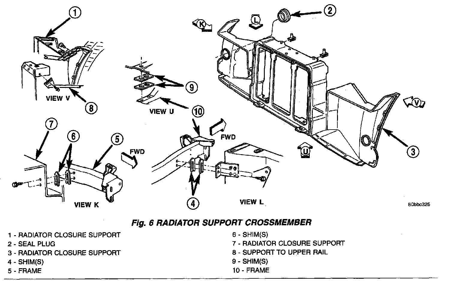 3. Remove fasteners attaching radiator support crossmember to the lower frame (Fig. 6).