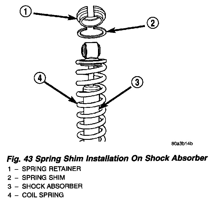 SHIMMINGOn vehicles with the standard suspension, spring shims or reduced height seats may be installed on the front or rear shock assemblies. Spring shim installation increases coil spring preload, thus raising the curb height of the vehicle. Reduced spring seat installation decreases coil spring preload, thus lowering the curb height of the vehicle.