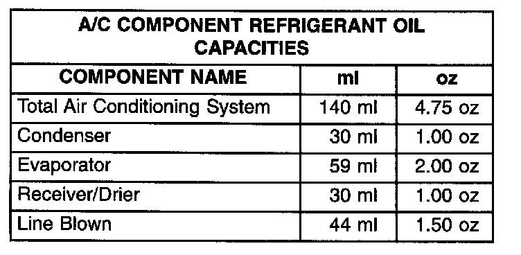 When an air conditioning system is first assembled, all components (except the compressor) are refrigerant oil free. After the system has been charged with R-134a refrigerant and operated, the oil in the compressor is dispersed through the lines and components. The evaporator, condenser, and filter- drier will retain a significant amount of oil, refer to the Refrigerant Oil Capacities Chart. When a component is replaced, the specified amount of refrigerant oil must be added. When the compressor is replaced, the amount of oil that is retained in the rest of the system must be drained from the replacement compressor. When a line or component has ruptured and oil has escaped, the compressor should be removed and drained. The filter-drier must be replaced along with the ruptured part. The oil capacity of the system, minus the amount of oil still in the remaining components, can be measured and poured into the suction port of the compressor.