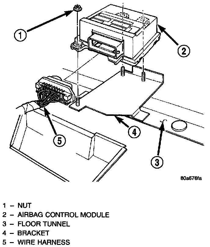 WARNING: THE AIRBAG CONTROL MODULE CONTAINS THE IMPACT SENSOR, WHICH ENABLES THE SYSTEM TO DEPLOY THE AIRBAG. TO AVOID ACCIDENTAL DEPLOYMENT, NEVER CONNECT THE AIRBAG CONTROL MODULE ELECTRICALLY TO THE SYSTEM UNLESS IT IS BOLTED TO THE VEHICLE. NEVER STRIKE OR KICK THE AIRBAG CONTROL MODULE. BEFORE BEGINNING ANY AIR- BAG SYSTEM REMOVAL OR INSTALLATION PROCEDURES, DISCONNECT AND ISOLATE THE BATTERY NEGATIVE (GROUND) CABLE FROM THE VEHICLE BATTERY. THEN WAIT TWO MINUTES FOR THE SYSTEM CAPACITOR TO DISCHARGE BEFORE FURTHER SYSTEM SERVICE. THIS IS THE ONLY SURE WAY TO DISABLE THE AIRBAG SYSTEM. FAILURE TO DO THIS COULD RESULT IN ACCIDENTAL AIRBAG DEPLOYMENT, AND POSSIBLE PERSONAL INJURY.REMOVAL