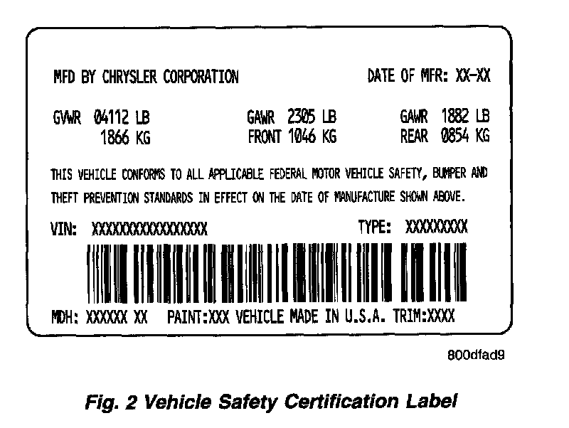A vehicle safety certification label (Fig. 2) is attached to the rear facing of the driver's door. This label indicates date of manufacture (month and year), Gross Vehicle Weight Rating (GVWR), Gross Axle Weight Rating (GAWR) front, Gross Axle Weight Rating (GAWR) rear and the Vehicle Identification Number (VIN). The Month, Day and Hour of manufacture is also included.