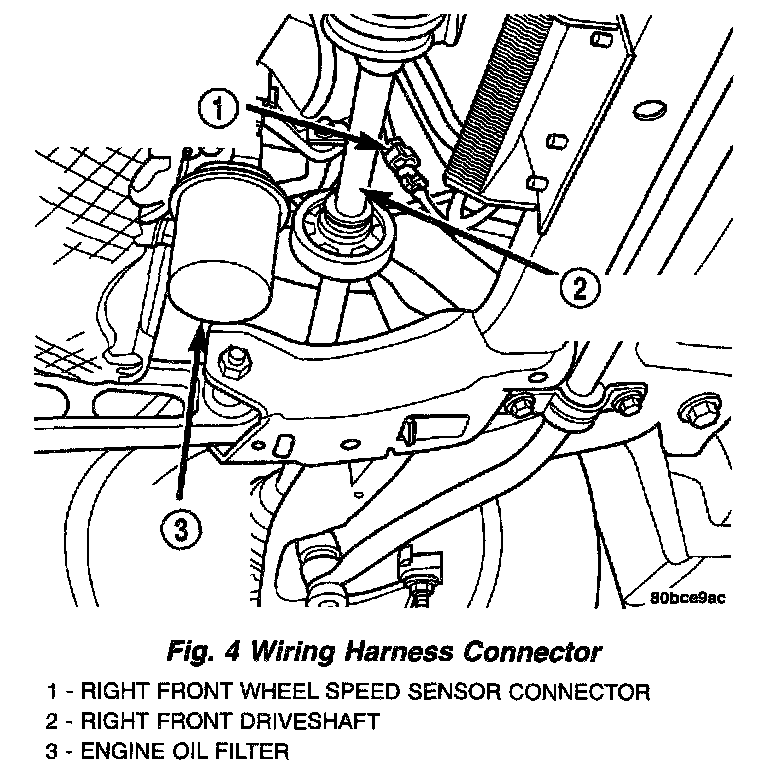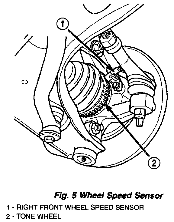 2. Disconnect the Wheel Speed Sensor (WSS) cable connector from the wiring harness on the inside of the frame rail above the front suspension crossmember. The connector has a locking tab which that must be pulled back before the connector release tang can be depressed, releasing the connection.