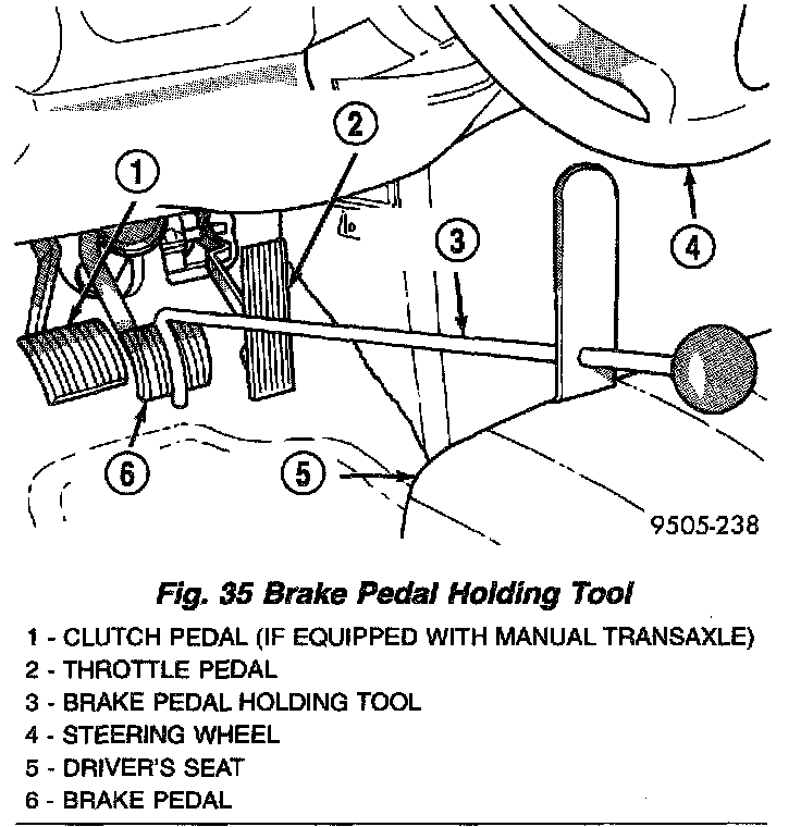 1. Using a brake pedal holding tool as shown, depress the brake pedal past its first one inch of travel and hold it in this position. This will isolate the master cylinder from the brake hydraulic system and will not allow the brake fluid to drain out of the master cylinder reservoir when the lines are opened.