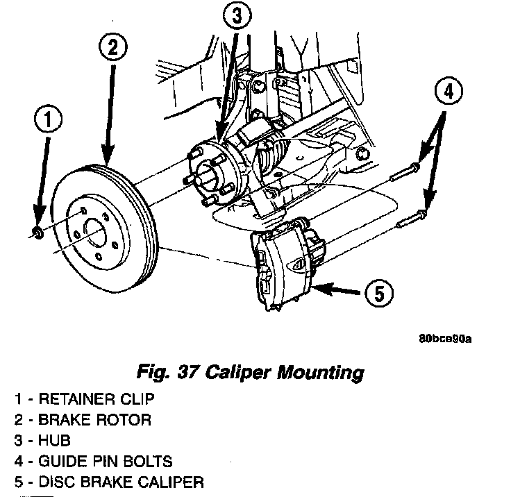 5. Remove the two brake caliper to steering knuckle guide pin bolts.
