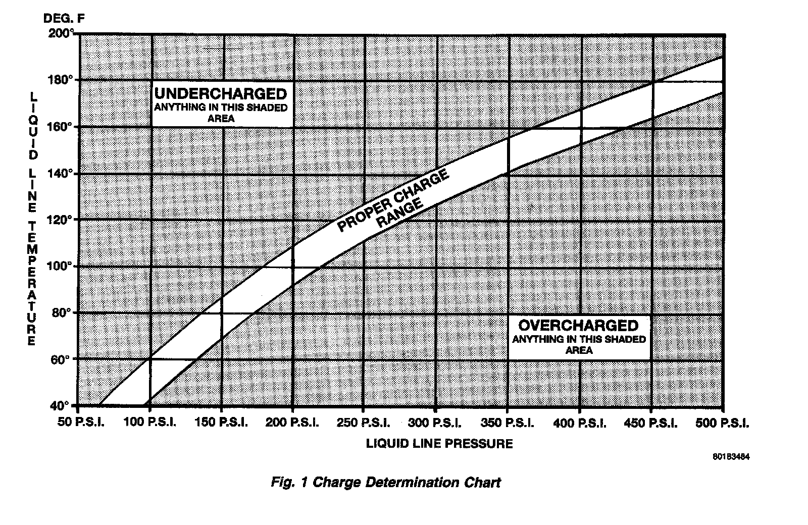 5. Observe filter/drier pressure and Liquid line temperature. Using the Charge Determination Chart determine where the system is currently operating. If the system is not in the proper range, reclaim all the refrigerant and recharge per A/C label.