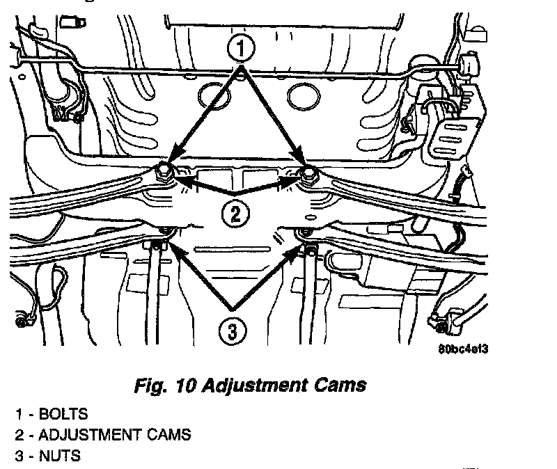 CAUTION: When adjusting rear toe, the notches on the toe adjustment cams are not to be facing down. The notches in the adjustment cams are only to be facing up or toward one side.