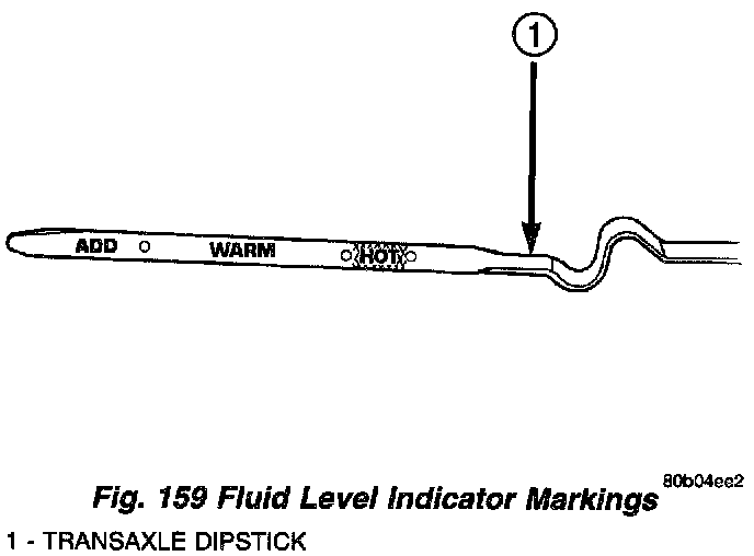The torque converter fills in both the P Park and N Neutral positions. Place the selector lever in P Park to be sure that the fluid level check is accurate. The engine should be running at idle speed for at least one minute, with the vehicle on level ground. This will assure complete oil level stabilization between differential and transmission. The fluid should be at normal operating temperature (approximately 82°C or 180°F). The fluid level is correct if it is in the HOT region (crosshatched area) on the fluid level indicator (Fig. 159).