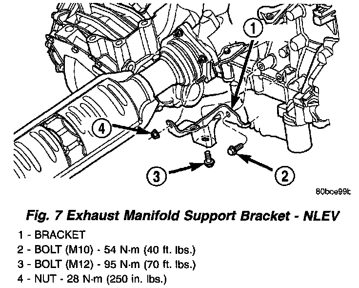 2. Install exhaust manifold support bracket (NLEV only). Tighten M10 bolt to 54 Nm (40 ft. lbs.), M12 bolt to 95 Nm (70 ft. lbs.), and nut to 28 Nm (250 inch lbs.).