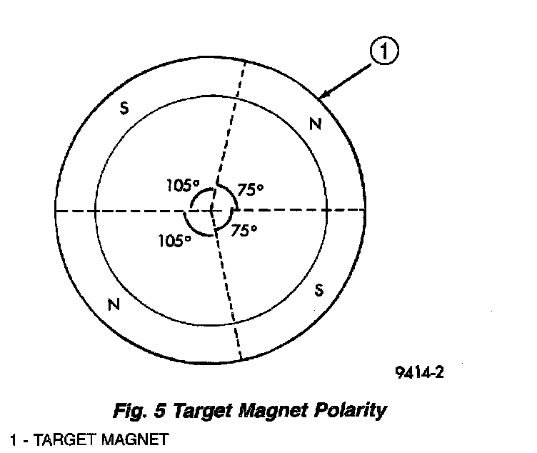 A target magnet attaches to the rear of the camshaft and indexes to the correct position. The target magnet has four different poles arranged in an asymmetrical pattern . As the target magnet rotates, the camshaft position sensor senses the change in polarity. The sensor output switch switches from high (5.0 volts) to low (0.5 volts) as the target magnet rotates. when the north pole of the target magnet passes under the sensor, the output switches high. The sensor output switches low when the south pole of the target magnet passes underneath.