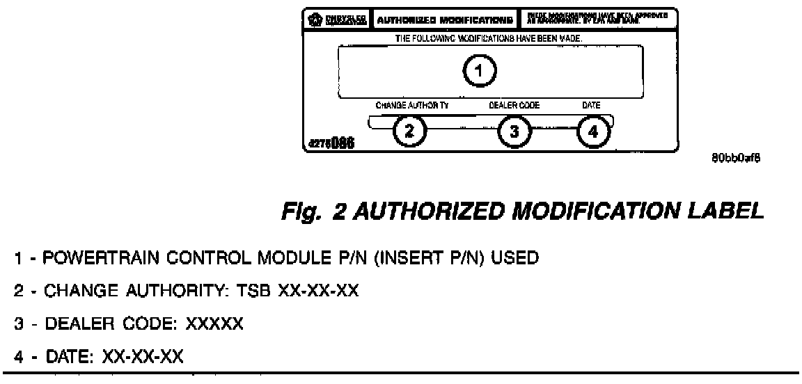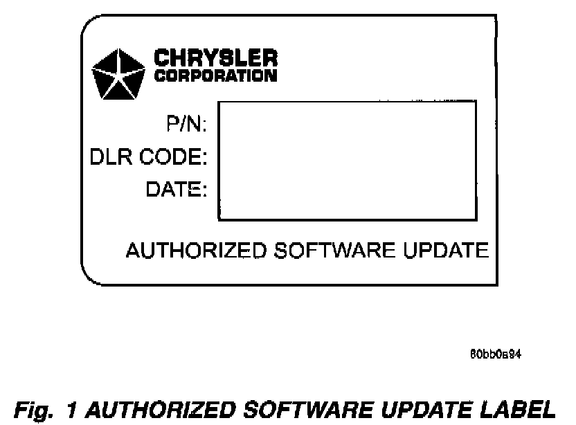 7. Type the necessary information on the "authorized Software Update Label" p/n 04669020 (Fig. 1). Attach the label to the PCM and cover the label with the clear plastic overlay.