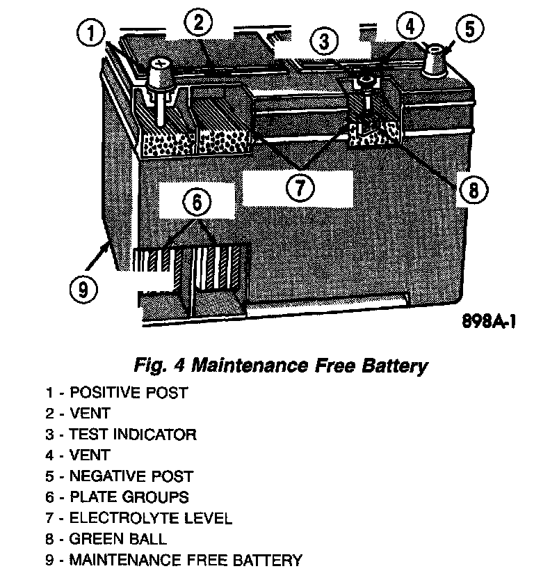 Maintenance-free batteries have non-removable battery vent caps (Fig. 4). Water cannot be added to this battery. Under normal service the composition of this battery reduces gassing and water loss at normal charge rates. If the battery electrolyte level becomes low, this battery must be replaced.