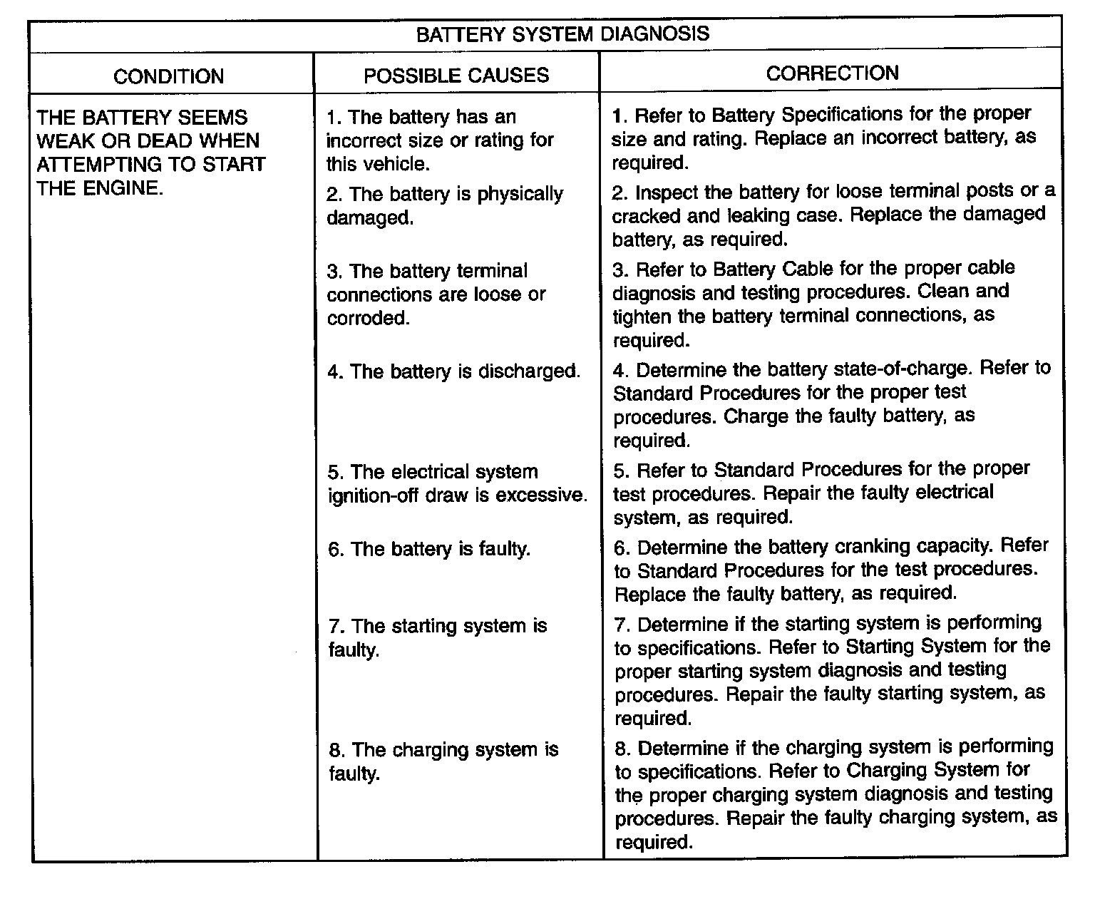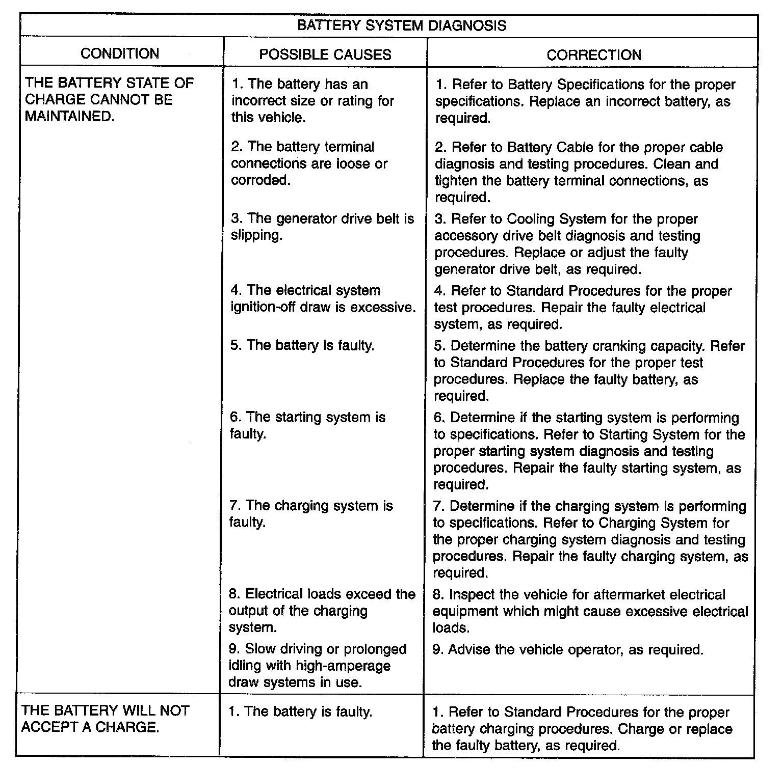 The battery, starting, and charging systems in the vehicle operate with one another and must be tested as a single complete system. In order for the engine to start and the battery to charge properly, all of the components that are used in these systems must perform within specifications. It is important that the battery, starting, and charging systems be thoroughly tested and inspected any time a battery needs to be charged or replaced. The cause of abnormal battery discharge, overcharging or early battery failure must be diagnosed and corrected before a battery is replaced and before a vehicle is returned to service. The service information for these systems has been separated to make it easier to locate the specific information you are seeking. However, when attempting to diagnose any of these systems, it is important that you keep their interdependency in mind.