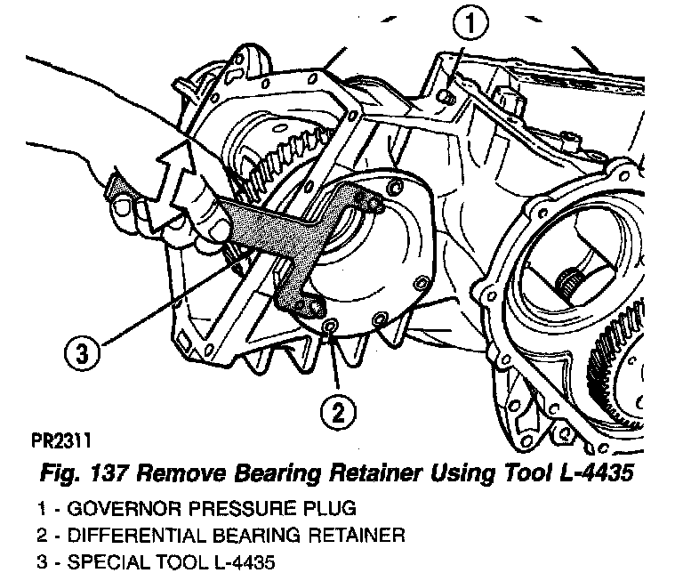 8. Remove bearing retainer from transaxle. Use to L-4435 to aid in removal by rotating retainer out of assembly (Fig. 137). Clean surfaces of old adhesive prior to reassembly.