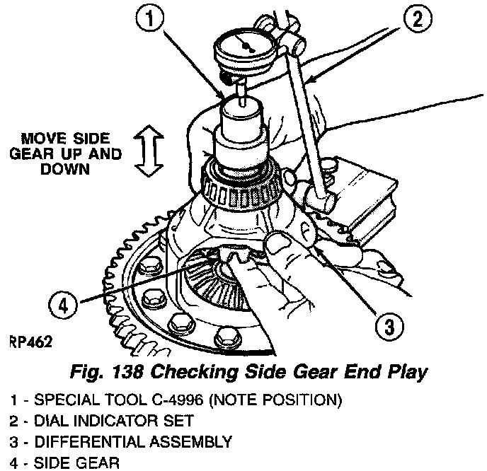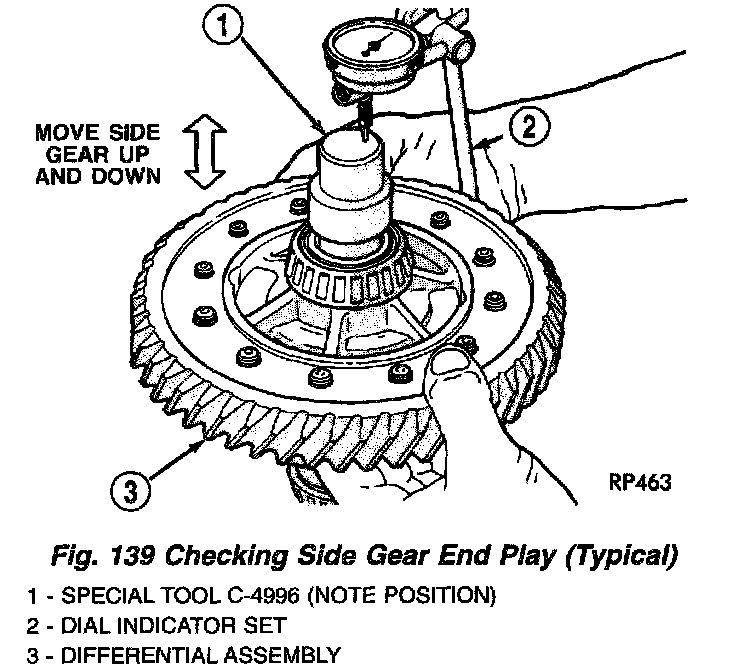 11. Measure and record differential side gear end play using dial indicator C-3339 and Tool C-4995 as shown in (Fig. 138) and (Fig. 139). Side gear end play must be within 0.001 - 0.013 inch Replace differential assembly if outside this range.
