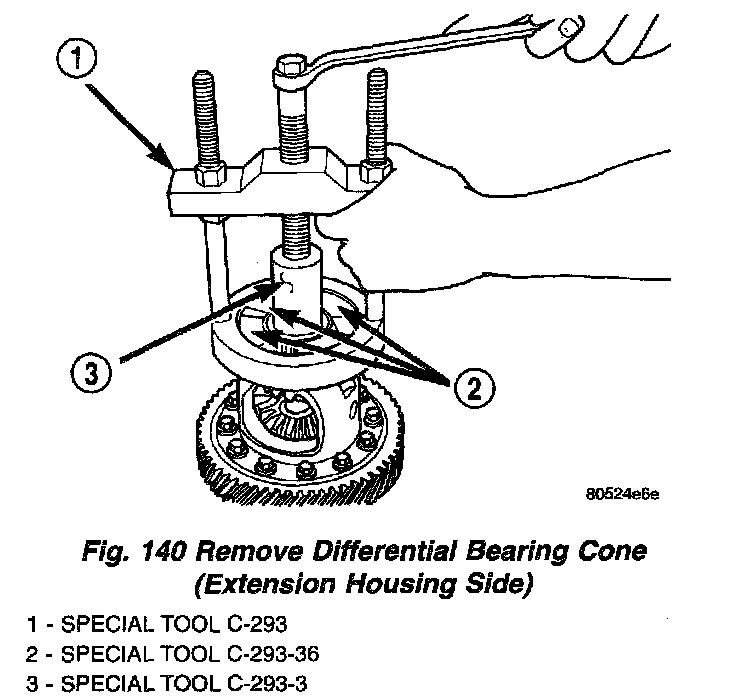 12. Remove differential bearing cone (from extension housing side) using Tool C-293, and adapters C-293-3, and C-293-36 (Fig. 140).
