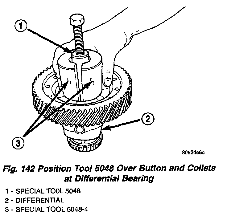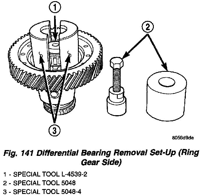 13. Set up tools as shown in (Fig. 141) and (Fig. 142) to facilitate differential bearing removal from ring gear side.
