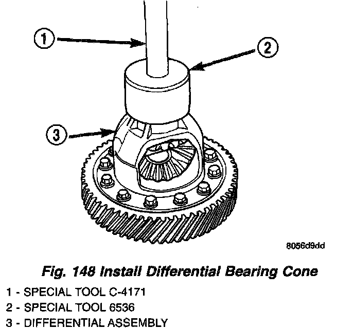 2. Position bearing cone onto differential (Fig. 147), and install bearing cone using Tool 6536 and driver handle C-4171 (Fig. 148).