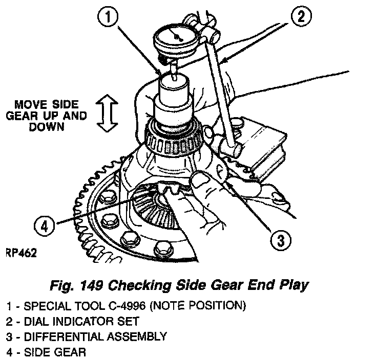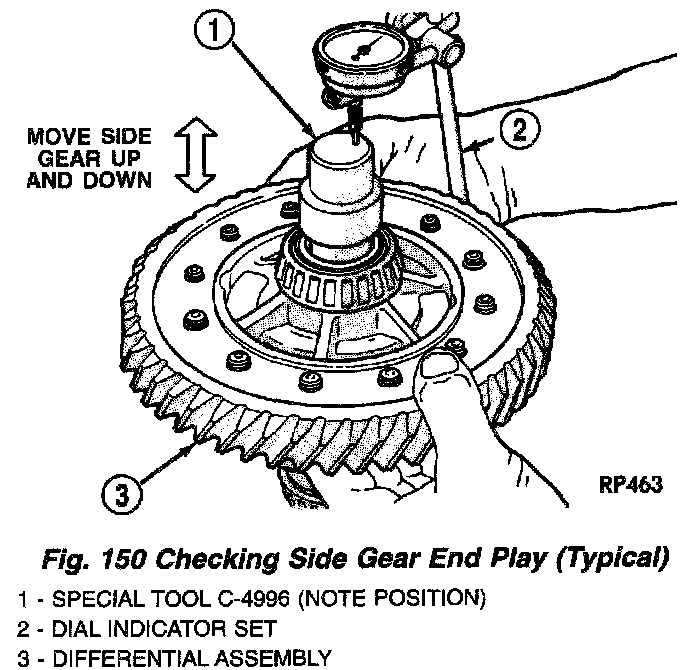 3. Measure side gear end play using dial indicator C-3339 and Tool C-4996 (Fig. 149) (Fig. 150). Side gear end play must be between 0.001 and 0.013 inch.