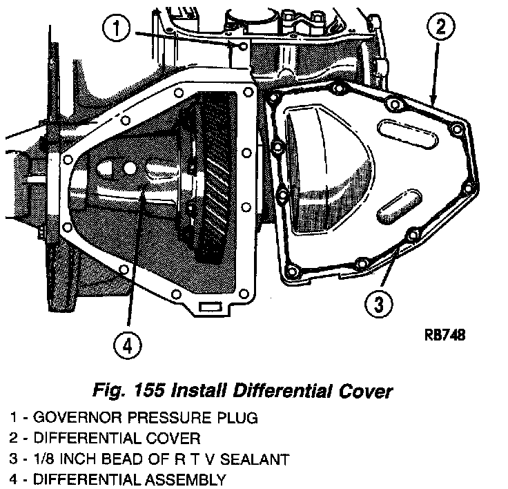 13. Apply an 1/8" bead of Mopar(R) Silicone Rubber Adhesive Sealant to the differential cover (Fig. 155).