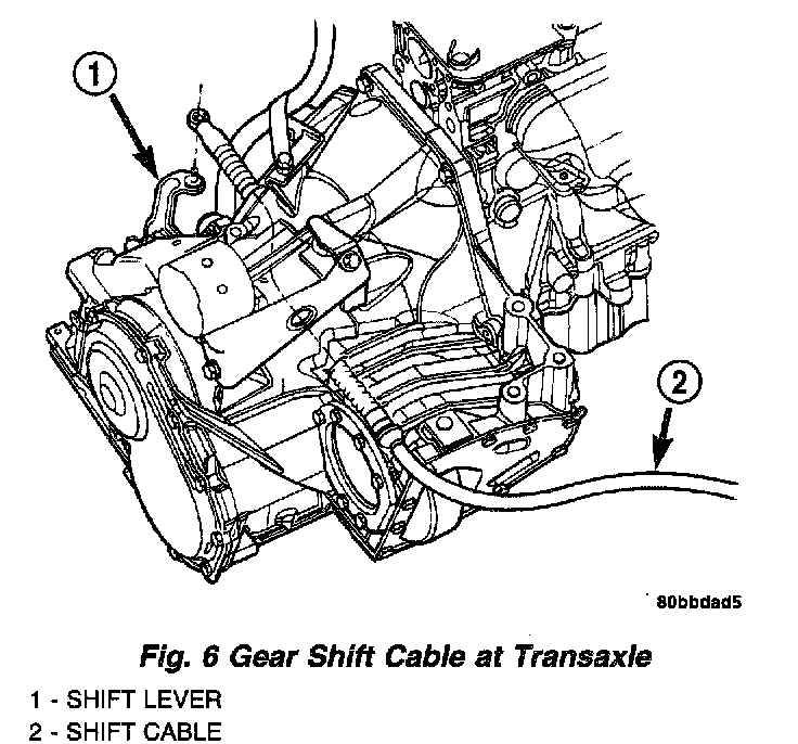 18. Install gear shift cable to bracket and connect to shift lever (Fig. 6).