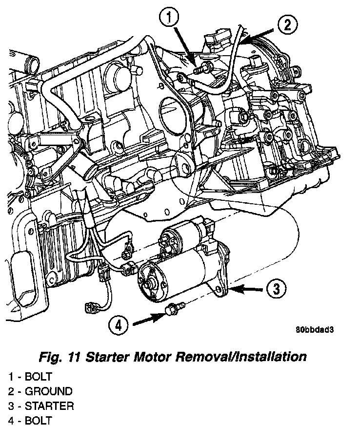 6. Install starter motor and tighten bolts to 54 Nm (40 ft. lbs.) torque. Make sure to fasten ground cable to upper starter bolt as shown in (Fig. 11).