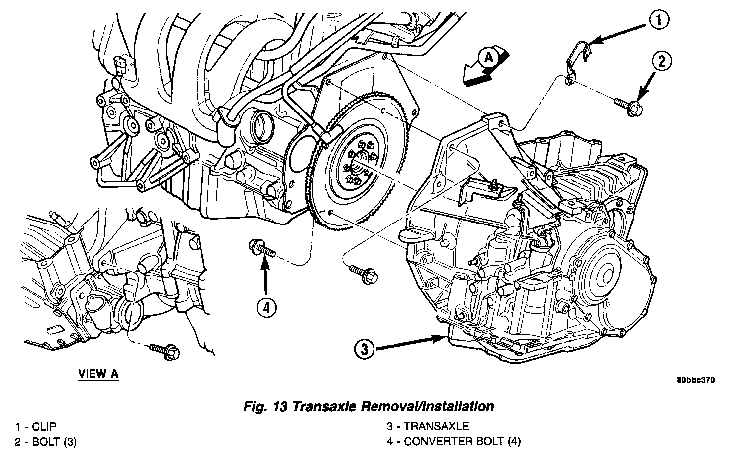 2. Install transaxle-to-engine mounting bolts (Fig. 13)and tighten to 95 Nm (70 ft. lbs.) torque.