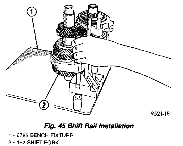 2. Install shift rails and forks into bench fixture (Fig. 45).