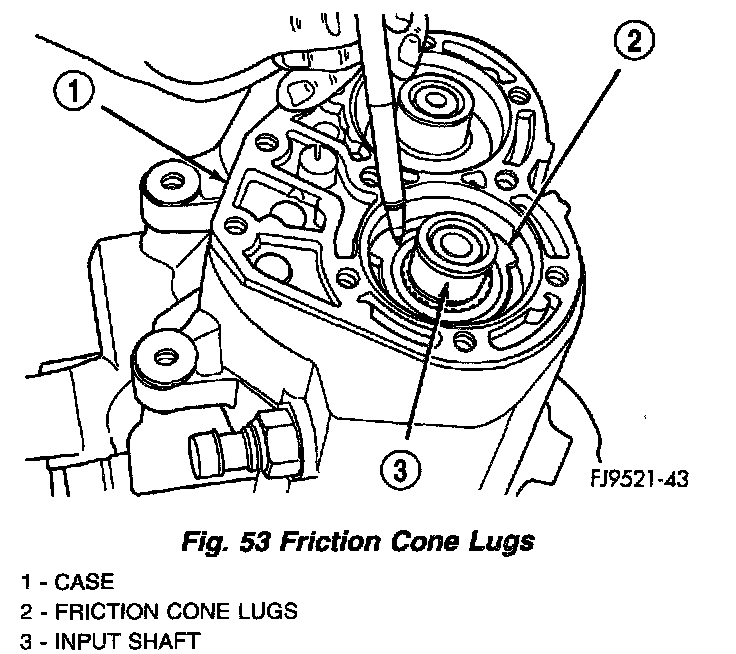 10. Line up reverse brake friction cone lugs to the slots in the gear case (Fig. 53). Verify reverse brake shim is in position.