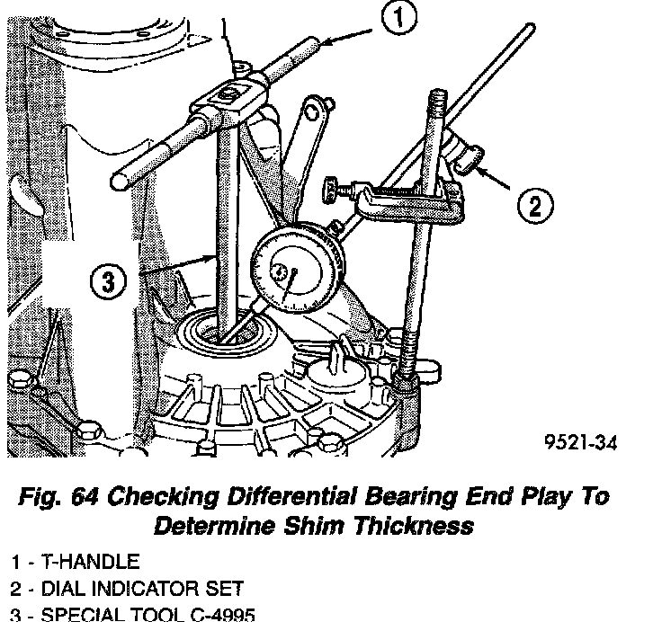 6. Apply a medium load to differential with Tool C-4995 and a T-handle, in the downward direction. Roll differential assembly back and forth a number of times. This will settle the bearings. Zero the dial indicator. To obtain end play readings, apply a medium load in an upward direction while rolling differential assembly back and forth (Fig. 64). Record end play.