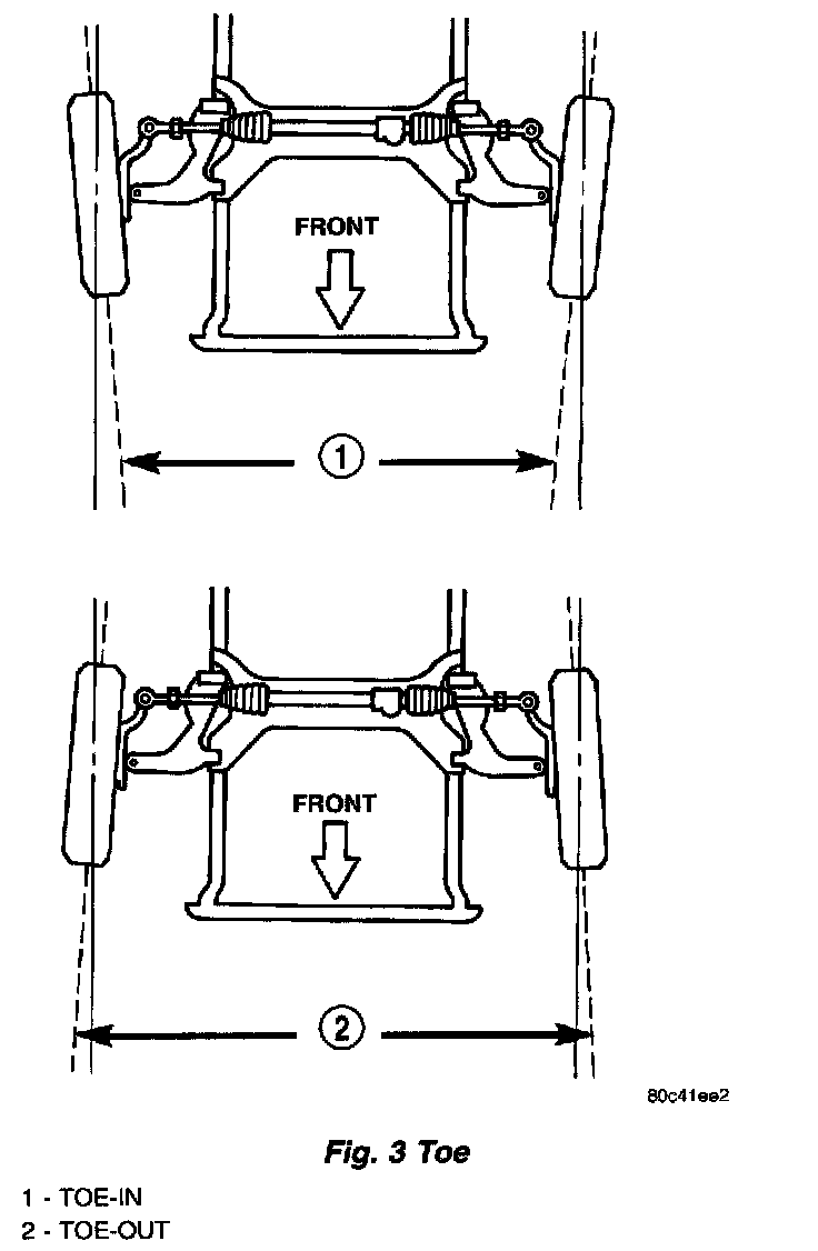 Dynamic toe pattern is the inward and outward toe movement of the front and rear tires through the suspension's jounce and rebound travel. As the vehicle's suspension moves up and down, the toe pattern varies. Toe pattern is critical in controlling the directional stability of the vehicle while in motion. Front and rear dynamic toe pattern is preset by the factory at the time the vehicle is assembled.