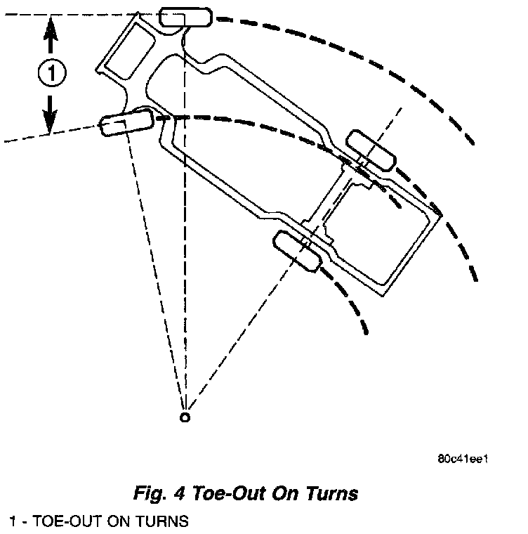 Toe-out on turns is the relative positioning of the front wheels while steering through a turn. This compensates for each front wheel's turning radius. As the vehicle encounters a turn, the outboard wheel must travel in a larger radius circle than the inboard wheel. The steering system is designed to make each wheel follow its particular radius circle. To accomplish this, the front wheels must progressively toe outward as the steering is turned from center. This eliminates tire scrubbing and undue tire wear when steering a vehicle through a turn.