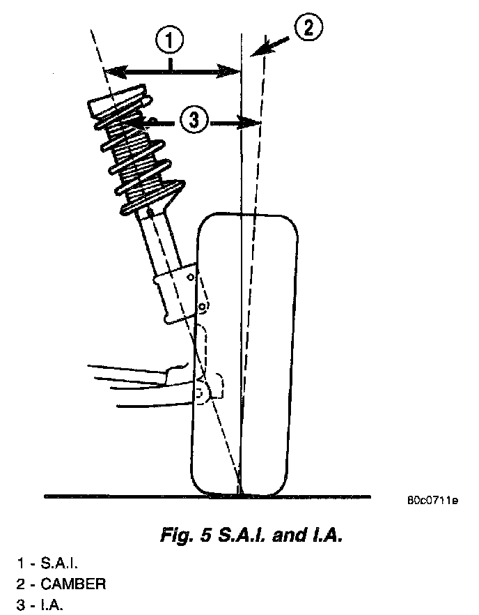 Steering axis inclination is the angle between a true vertical line starting at the center of the tire at the road contact point and a line drawn through the center of the upper ball joint (or strut) and the lower ball joint. S.A.I. is built into the vehicle and is not an adjustable angle. If S.A.I. is not within specifications, a bent or damaged suspension component may be the cause.