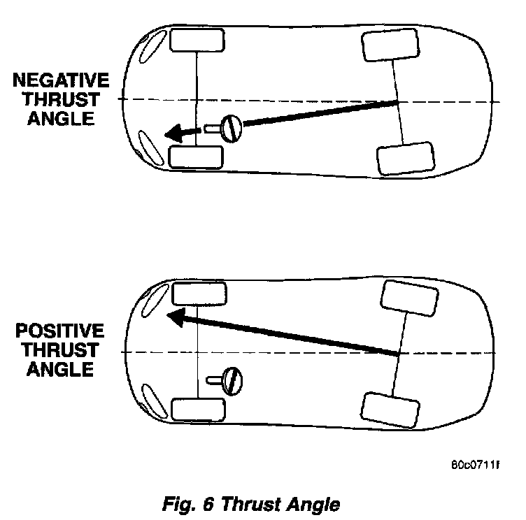 Thrust angle is the averaged direction the rear wheels are pointing in relation to the vehicle's center line. The presence of negative or positive thrust angle causes the rear tires to track improperly to the left or right of the front tires (dog tracking).