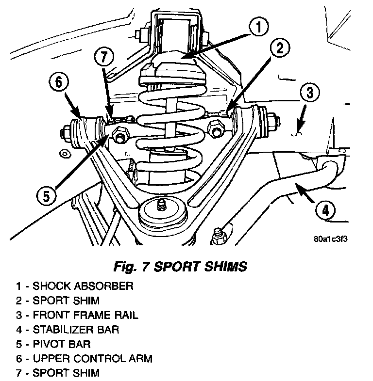 There are two sport shims used on each side of the vehicle's front suspension. There is one sport shim located at each of the front upper control arm pivot bar to frame attaching studs.