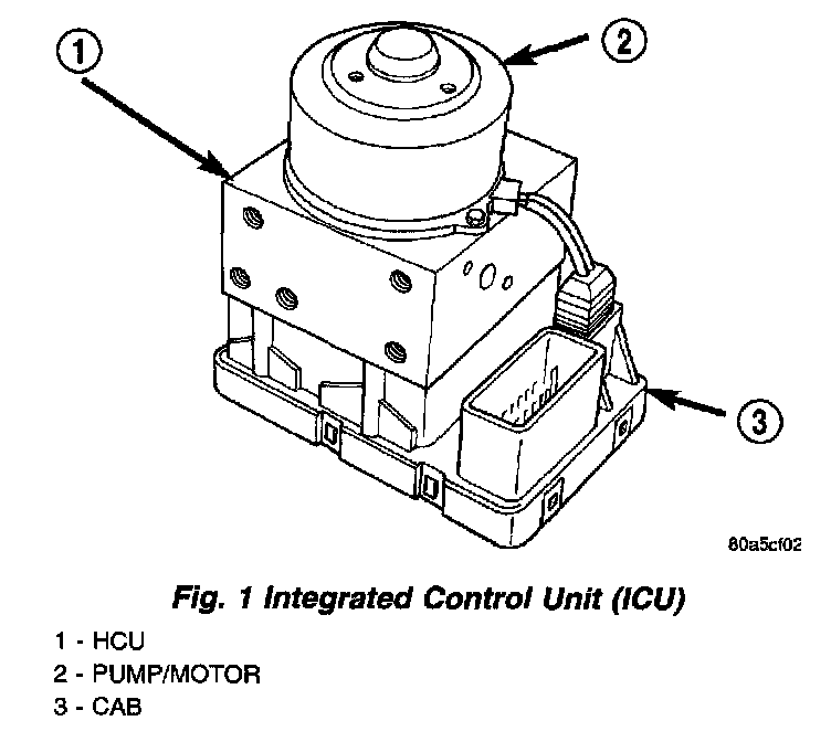 The controller antilock brake (CAB) is a microprocessor-based device which monitors the ABS system during normal braking and controls it when the vehicle is in an ABS stop. The CAB is mounted to the HCU (hydraulic control unit) as part of the ICU (integrated control unit). The CAB uses a 25-way electrical connector on the vehicle wiring harness. The power source for the CAB is through the ignition switch in the RUN or ON position.