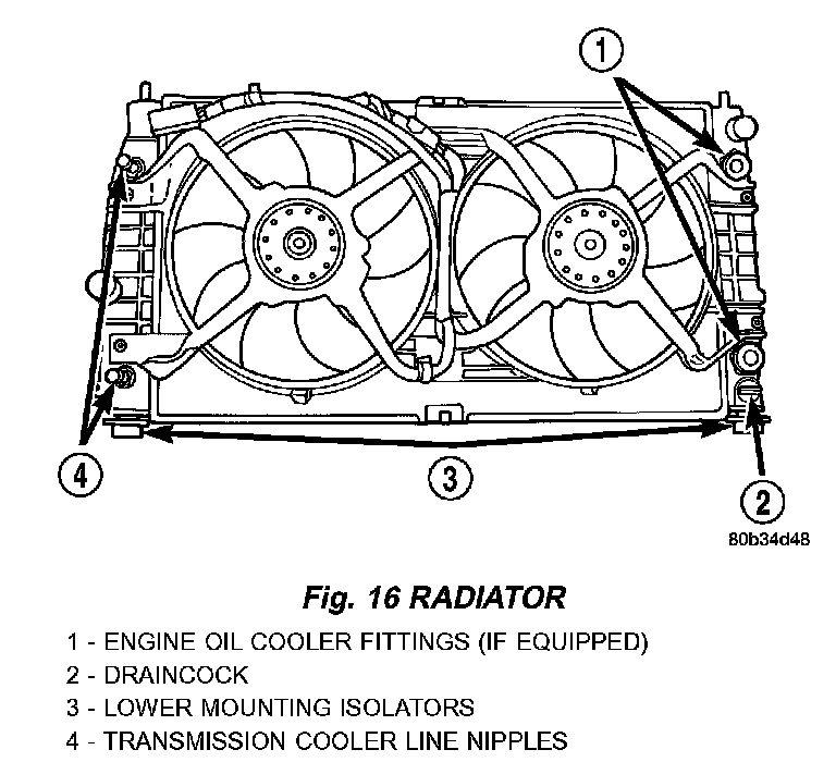 1. Position radiator into engine compartment. Seat the radiator assembly lower rubber isolators into the mounting holes in radiator lower support.