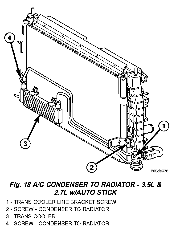 10. Remove fastener attaching transmission cooler line bracket to left side of radiator.