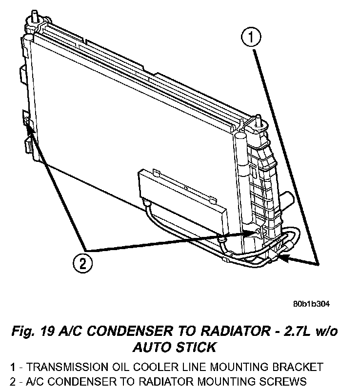 9. Remove the air conditioning condenser attaching screws located at the front of the radiator.